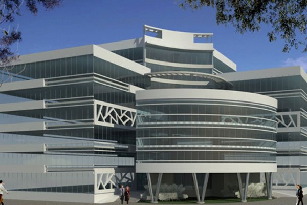 - The shape of the Building plan form is taken as plus sign having work stations in each wing connected by a central interactive space the central atrium. The above one is conceptual view of the building and the photo below is of the actual building.